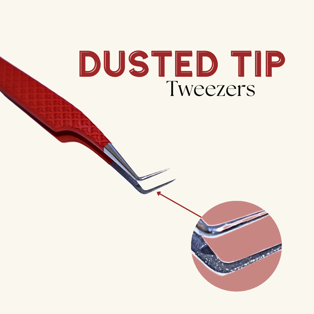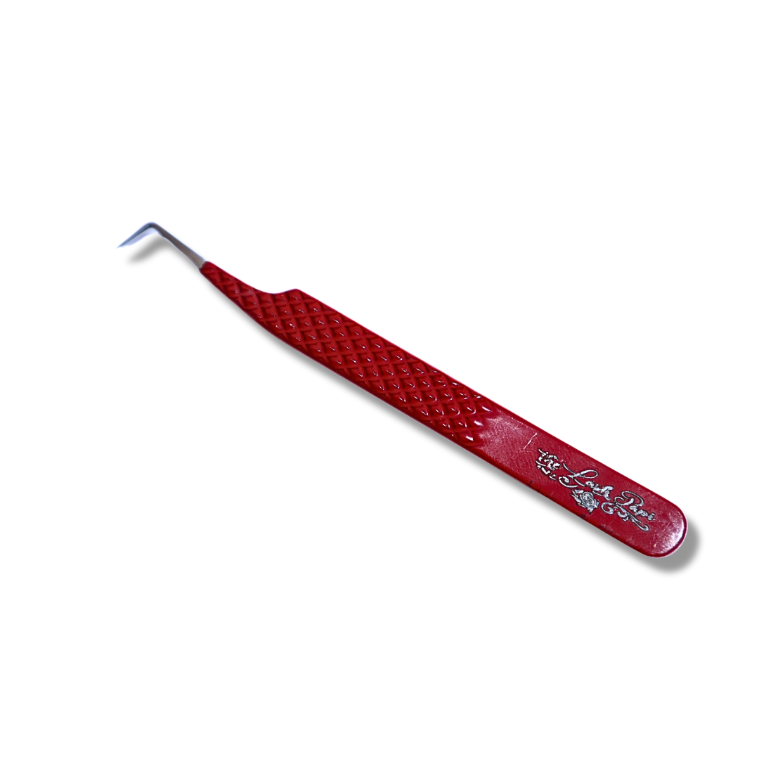 Stainless steel tweezer with a diamond grip texture for comfort and complete closure, best used for mega volume and pinching technique.